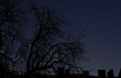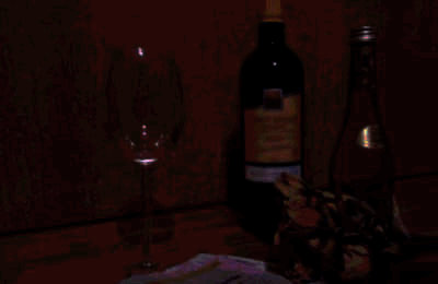 「ワインが置いてあるテーブル」と「人気のない夜のお墓」と「宵の月」の写真素材です。テーブルだけ加工モノです。テーブルの上にはドライフラワーが置いてあるんですが、暗すぎて何だかわかりませんね。(笑)